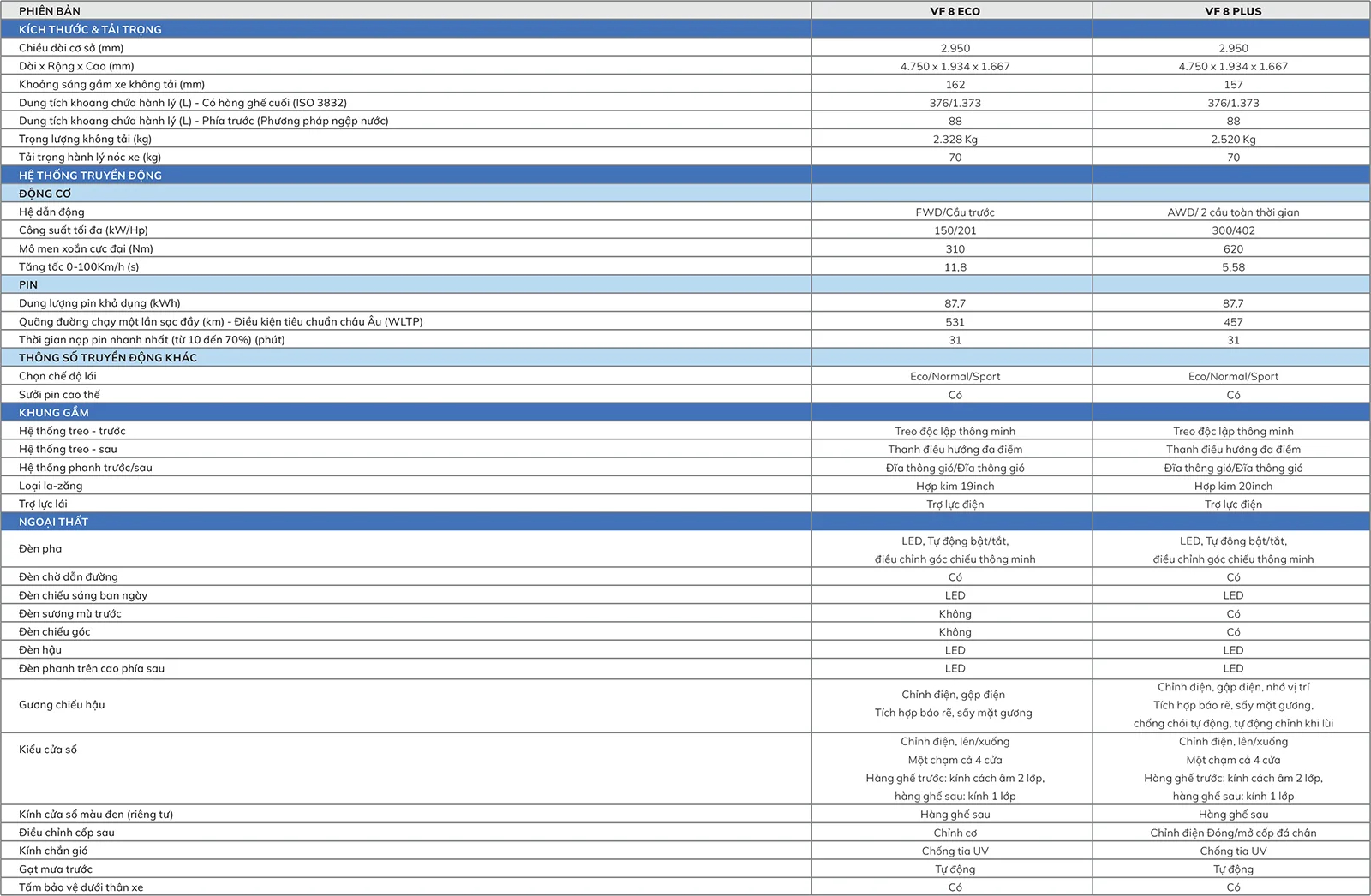 VF 8 được trang bị hai động cơ điện cho hệ dẫn động 4 bánh toàn thời gian (AWD), với hai phiên bản: Eco (công suất 260 kW/349 mã lực, mô-men xoắn 500 Nm) và Plus (công suất 300 kW/402 mã lực, mô-men xoắn 620 Nm). Xe có khả năng tăng tốc 0-100 km/h trong khoảng 5,5 – 6,5 giây tùy phiên bản, phạm vi di chuyển từ 400 – 420 km cho mỗi lần sạc đầy theo tiêu chuẩn WLTP.