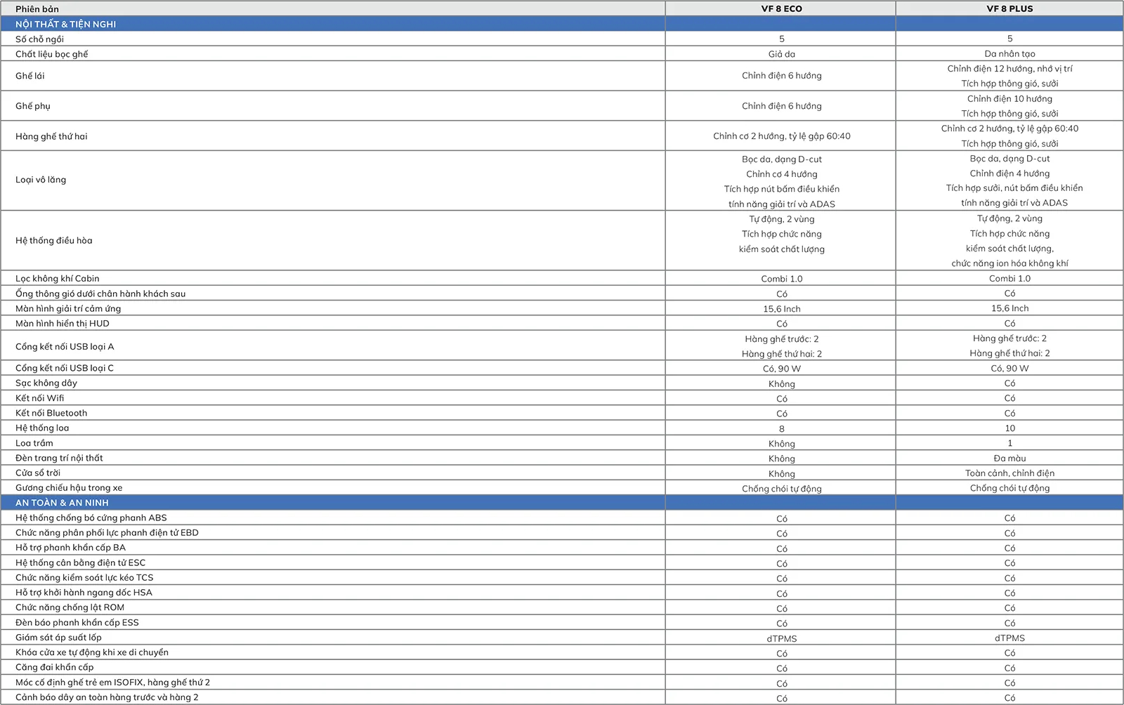 Ngoài ra, VF 8 được trang bị tới 11 túi khí, hệ thống đèn nội thất đa màu, các hộc chứa đồ thông minh và khoang hành lý rộng rãi cả phía sau và phía trước (frunk), đáp ứng tốt nhu cầu sử dụng hàng ngày và các chuyến đi xa.