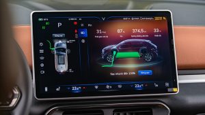 Trung tâm táp-lô là màn hình cảm ứng lớn 15,6 inch, đóng vai trò điều khiển hầu hết các tính năng giải trí, điều hòa, kết nối điện thoại, Wi-Fi/Bluetooth, trợ lý ảo và nhiều tiện ích hiện đại khác. Hệ thống âm thanh gồm 8 loa (Eco) hoặc 10 loa (Plus), đèn trang trí nội thất đa màu, điều hòa tự động 2 vùng, lọc không khí, cửa sổ trời chỉnh điện (bản Plus), cùng nhiều cổng USB-C tiện lợi.